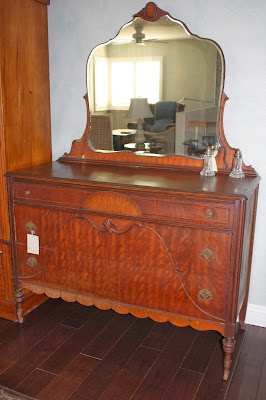 Here is a picture of the "before" dresser with a crackle finish on it. Yes, it is hideous, but admit it, the piece has good lines, details, and hardware.