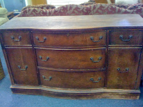 Here is a picture of the "before" dresser with a crackle finish on it. Yes, it is hideous, but admit it, the piece has good lines, details, and hardware.