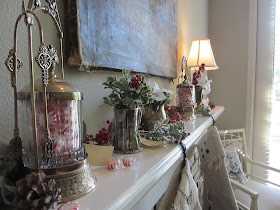 Consider using like materials for a cohesive look. Here I have silver plate items that are for sale at Pearl's Cottage's Etsy site coupled with greenery with red accents and some peppermint candies. My business partner, Michelle, set up these items in just a few minutes. The pickle castors are my favorite items because they are so detailed in their design and they harken back to a day where pickles were held in high esteem. Now they are filled with peppermint candies to give them a little holiday cheer.