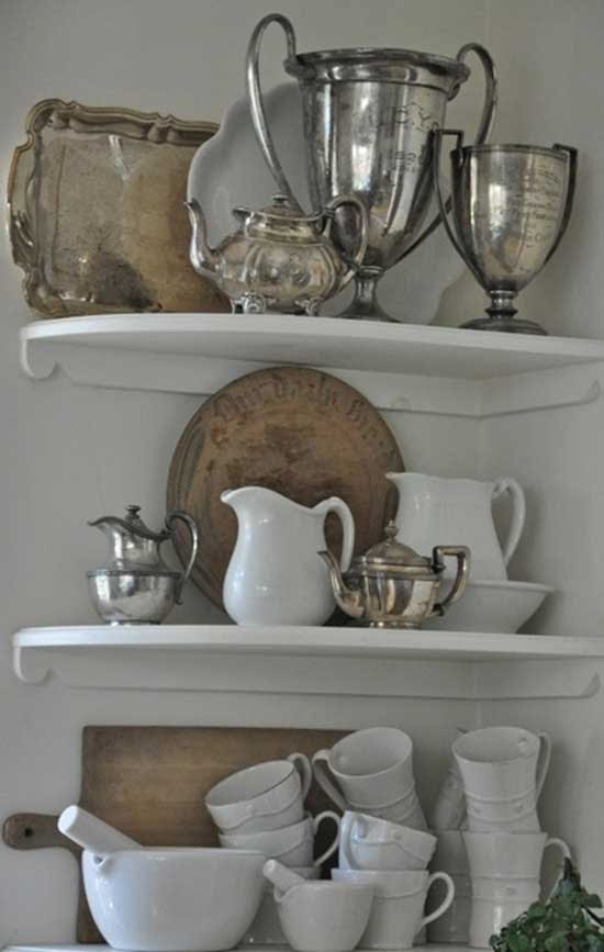 Silver adds personality to vintage decor. Tarnished silver pieces like candelabras, trays, champagne buckets, vases, coffee and tea pots, and water pitchers look great in shabby chic, farmhouse and vintage settings. The shiny items above are now tarnished because I don't have time nor the inclination to polish silver with regularity.